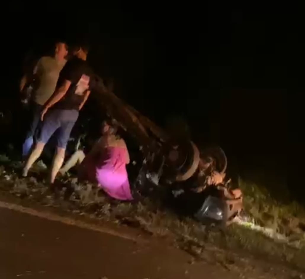 Com o impacto, o automóvel acabou capotando, deixando pelo menos uma pessoa ferida dentro do veículo.