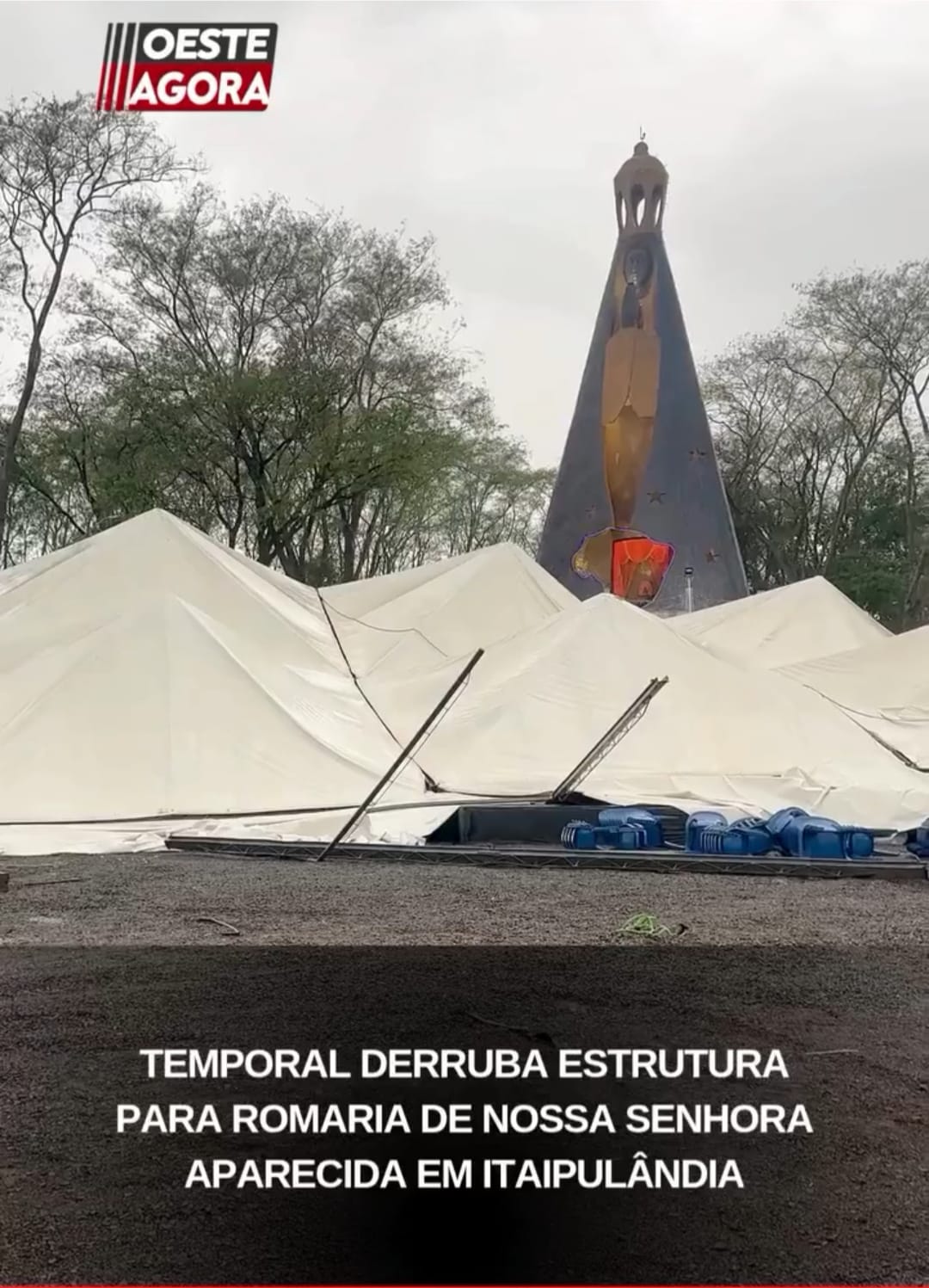 Um temporal registrado por volta das 11h da manhã desta terça-feira (30/09) derrubou parte da estrutura preparada para receber os romeiros na imagem de Nossa Senhora Aparecida, em Itaipulândia. As tendas, que já estavam organizadas para a semana de novenas e peregrinação que começam no dia 2 de outubro e seguem até o dia 12, foram ao chão devido à força do vento.