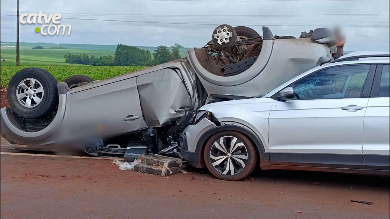 Uma caminhonete Mitsubishi L200, com placas do Mercosul, capotou e atingiu um T-Cross que seguia no sentido contrário. O veículo usava adesivos falsos da Itaipu para tentar despistar a fiscalização.