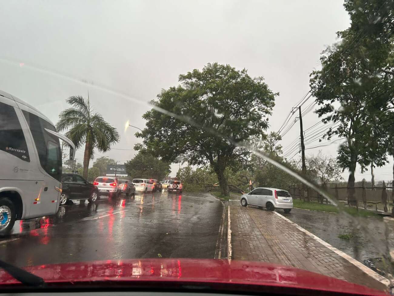 A forte chuva que atingiu Foz do Iguaçu por volta das 18h desta quinta-feira (7) provocou diversos estragos em diferentes regiões da cidade. A tempestade, acompanhada de vendaval, começou por volta das 17h30 e registrou acumulados de 5 milímetros na Região Norte, 30 milímetros na Região Leste e 21 milímetros na Região Sul, conforme dados dos pluviômetros automáticos do CEMADEN.